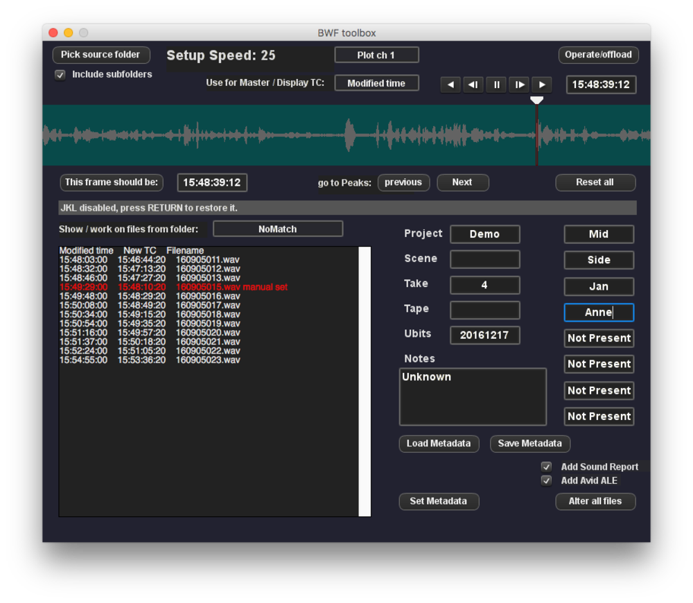 You can also set all metadata as is found normally in BWF files, or alter that if the files are BWF already.